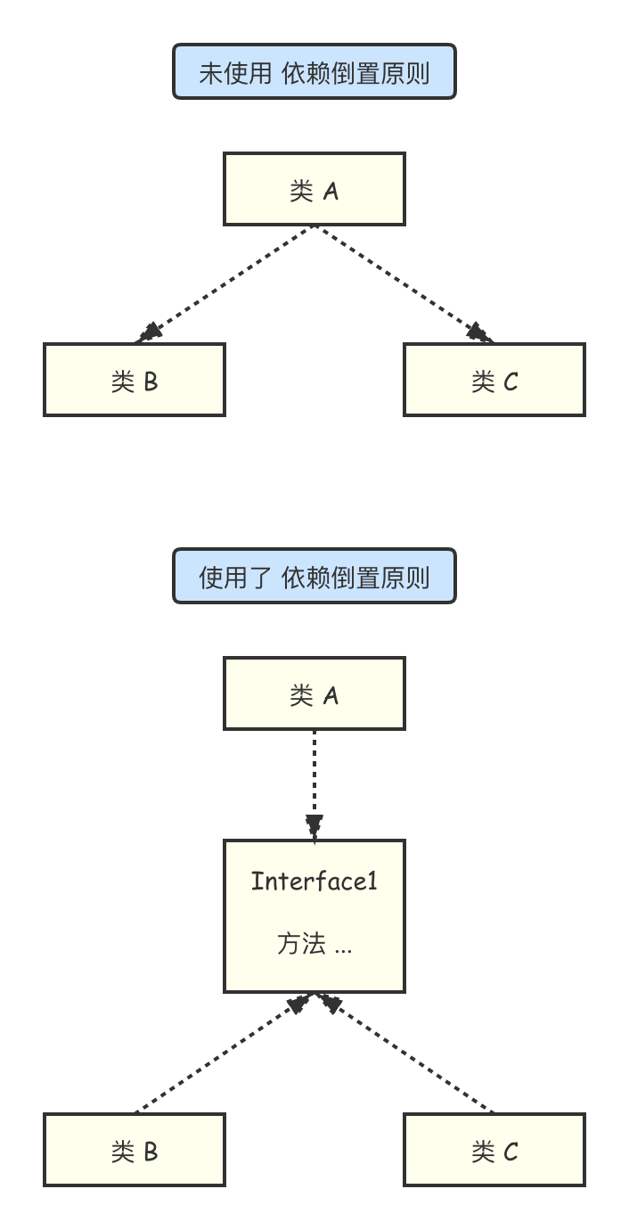 解决方案:将 类A 修改为依赖 接口Interface1,类B 和 类C 各自实现 接口Interface1,类A 通过 接口Interface1 间接与 类B 或者 类C 发生联系,则会大大降低修改 类A 的几率。