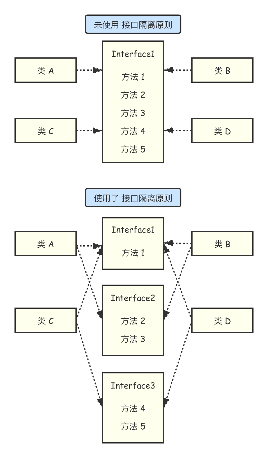 举个例子,类A 通过 Interface1 依赖类B,方法1,方法2,方法3;类B 通过 Interface1 依赖D,方法1,方法4,方法5,看下未使用接口隔离原则和使用了接口隔离原则发生了什么变化。