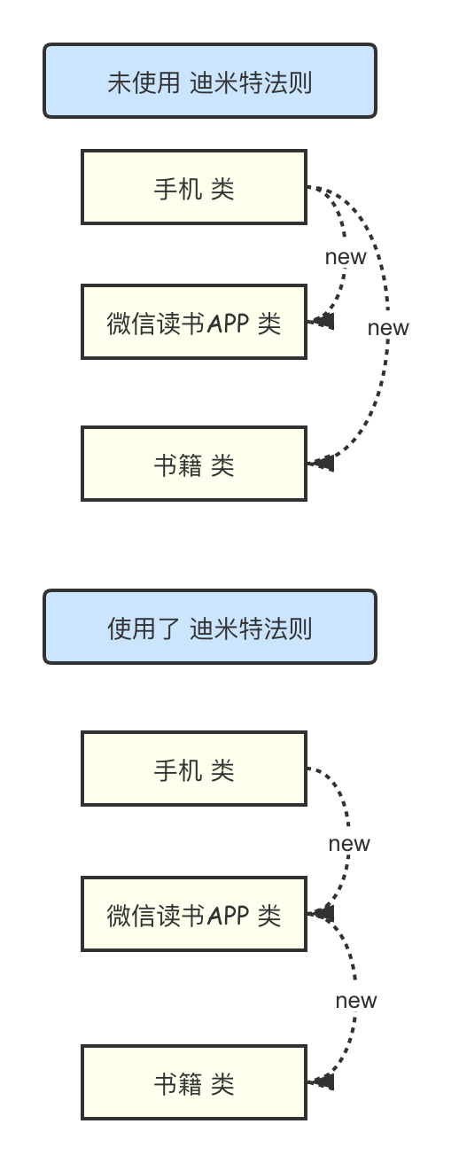 手机类 和 书籍类,这两个不能直接发生调用关系,需要 手机类 和 微信读书 APP 类先发生调用关系,然后微信读书 APP 类 再和 书籍 类可以发生调用关系,这样才遵循迪米特法则。
